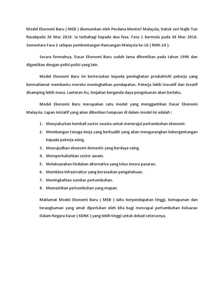Terlebih lagi model ekonomi berusaha menguji asumsi atau teori tentang perilaku ekonomi. MODEL EKONOMI BARUMEB Pengenalan Model Ekonomi Baru MEB diumumkan oleh Datuk Seri Mohd Najib pada 30 Mac 2010 dalam Persidangan Invest Malaysia 2010 di Kuala Lumpur.